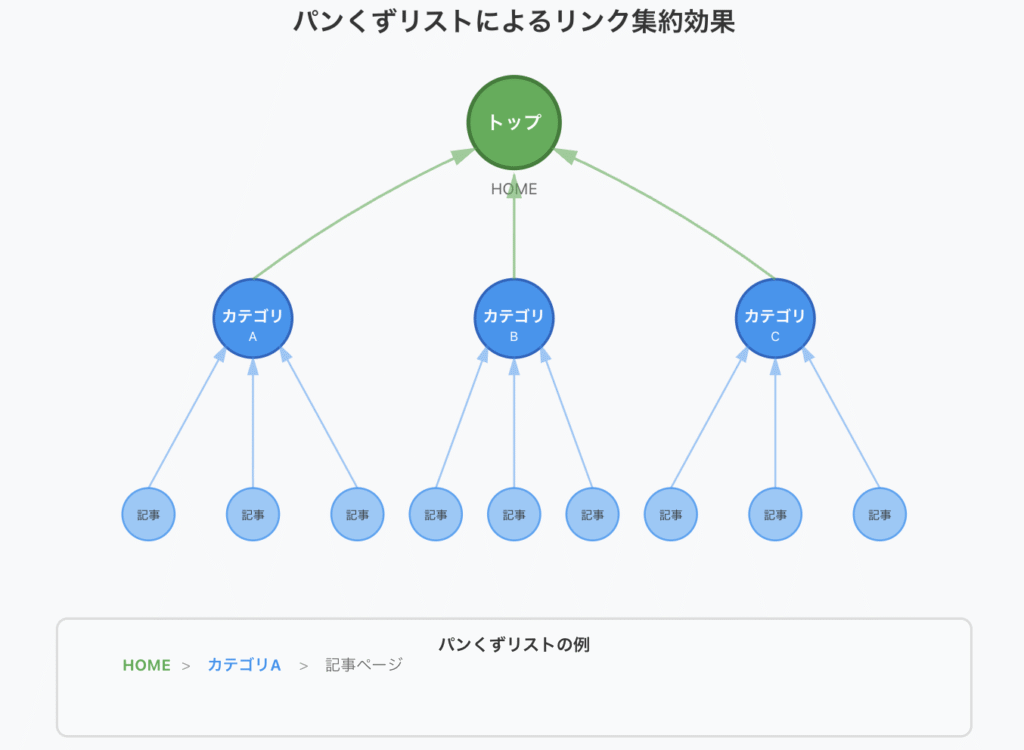 特に構造化データ(Schema.orgのBreadcrumbList)でマークアップすることで、クローラーは「このページがどのカテゴリの配下にあるか」を明確に認識できます。